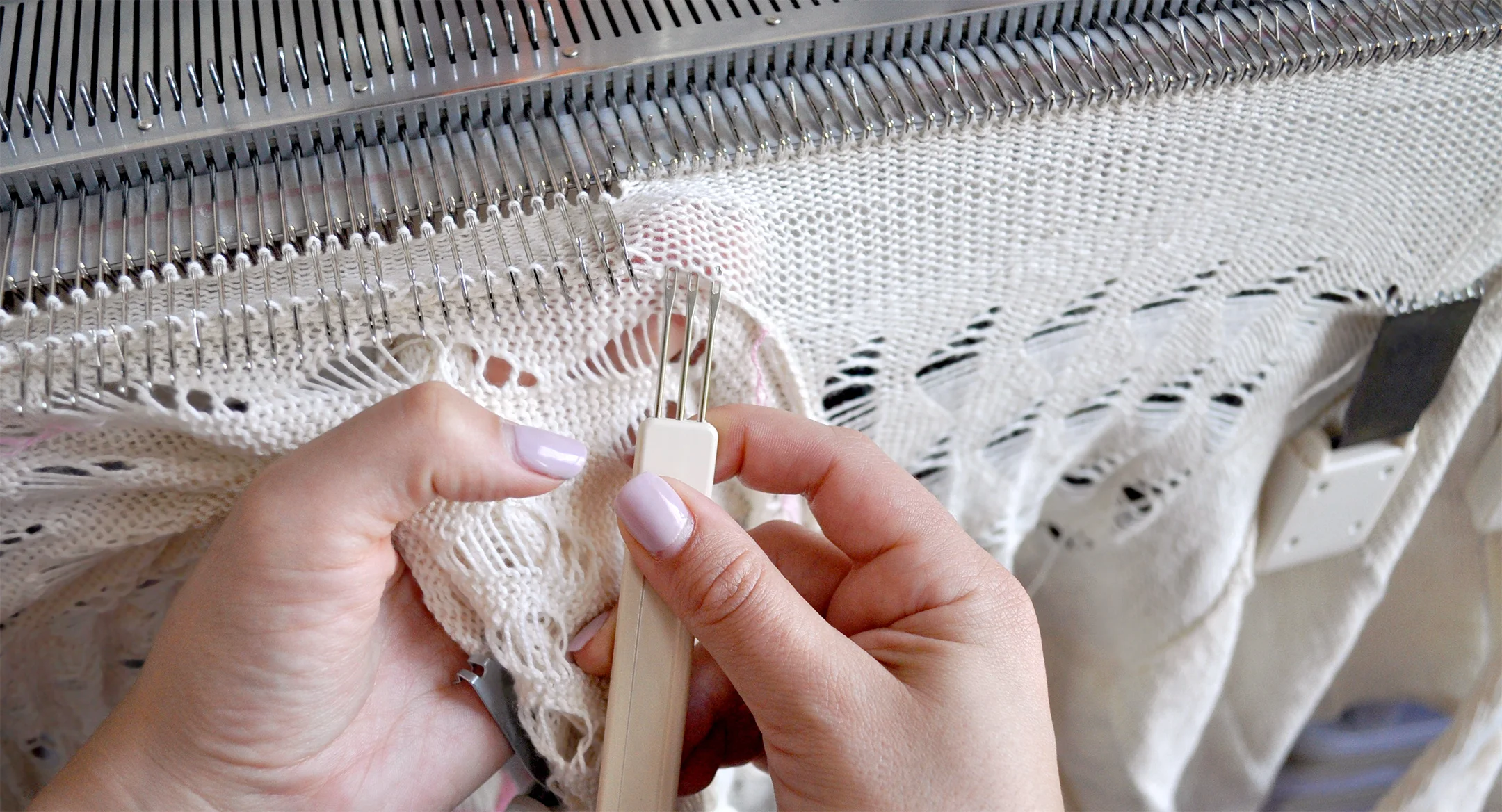 Knit, knit, knit. Literally. Each row of fabric is a push of the carriage. Every lace detail is a transfer of stitches. As you can image, this part of the process keeps my arms toned and my fingers nimble. This step also requires the most concentration. I need to be vigilant of what row I am on, what I need to do on that row, and on how the knitting on a whole is coming out.