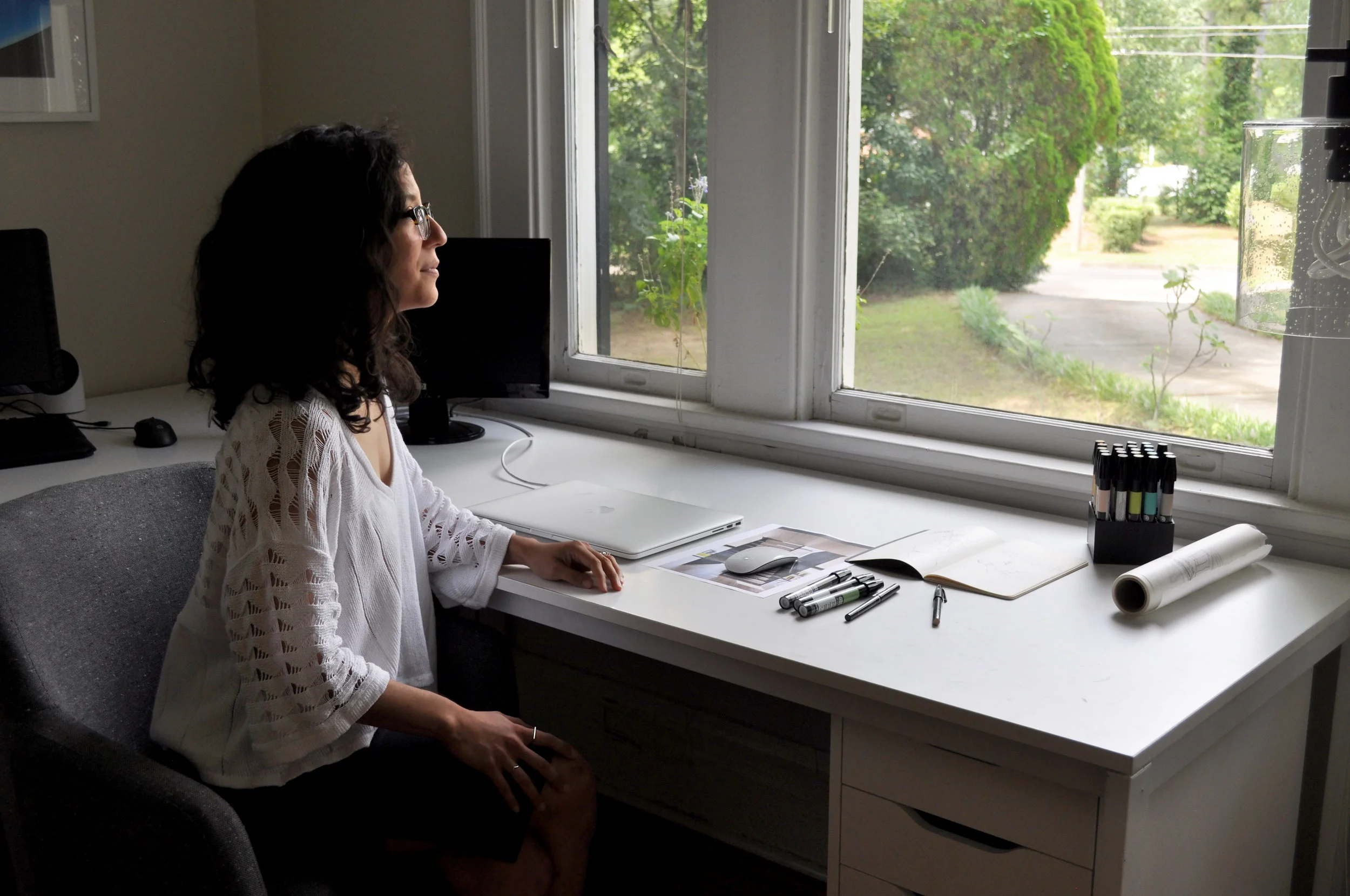 The Moonlight top paired with Rebecca's staple black pencil skirt adds an element of creativity to her professional look.