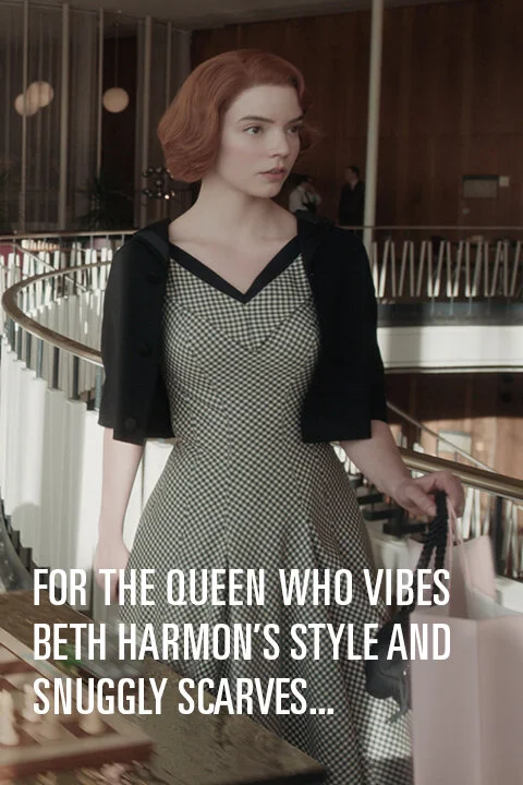 Featuring a classic herringbone patter in bright pops of color, i’s the kind of scarf you can really cozy up in while you slay Queen’s Gambit style.